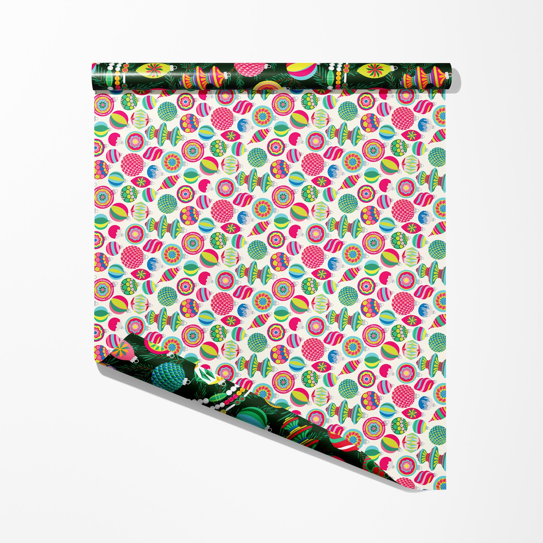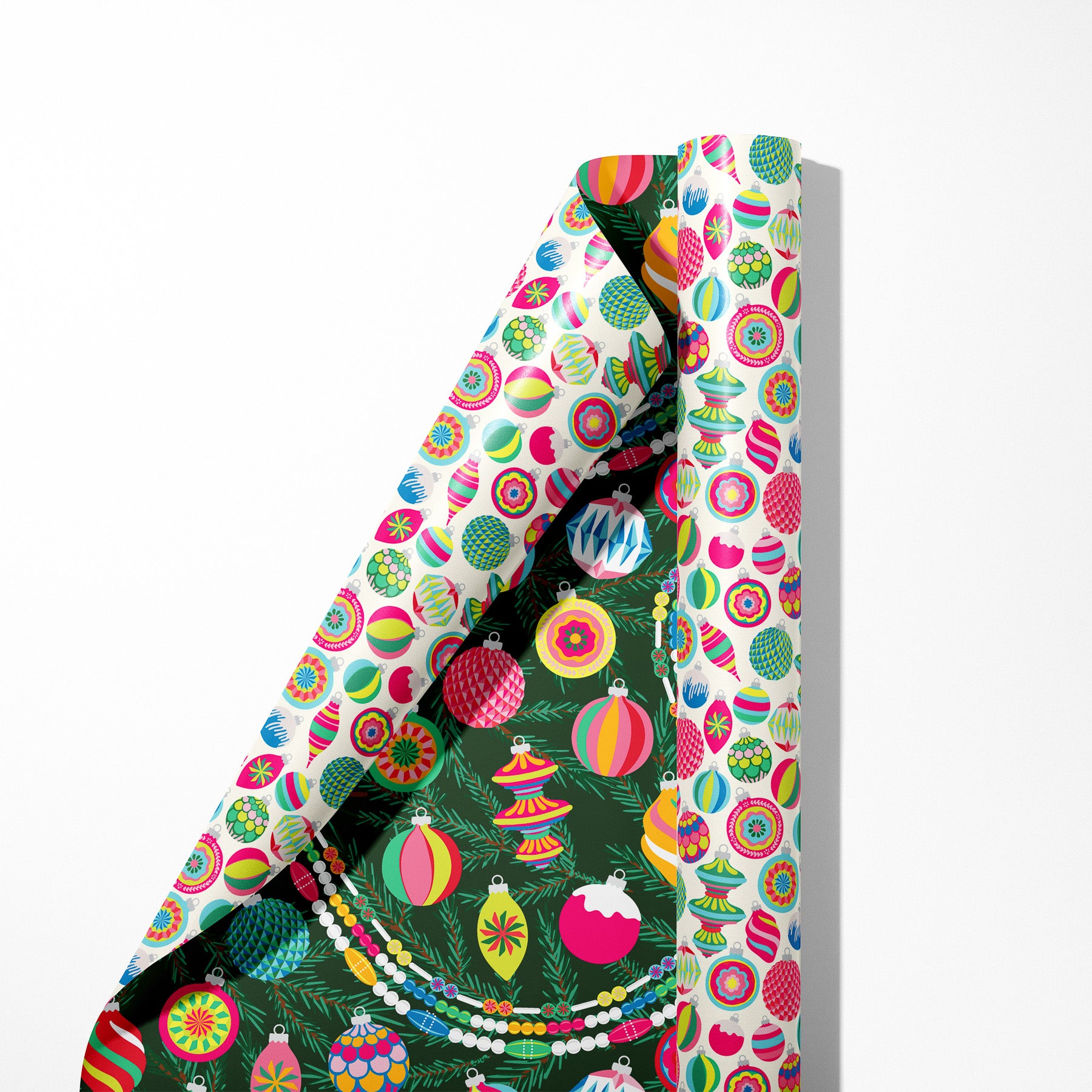 Wrap your gifts in festive flair with our Bright Baubles double-sided wrapping paper! Featuring a vibrant, retro-inspired ornament pattern on one side and a rich evergreen background with bold baubles and beaded garland on the other, this paper brings playful mid-century charm to every package.